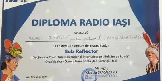 Membrii trupei Buratino, sub coordonarea doamnei profesoare Stegaru Diana, au participat la Concursul de Teatru Școlar – “Sub Reflector”- ediția a XIII-a , 12 aprilie 2025 (etapa interjudețeană) obținând premii pentru: